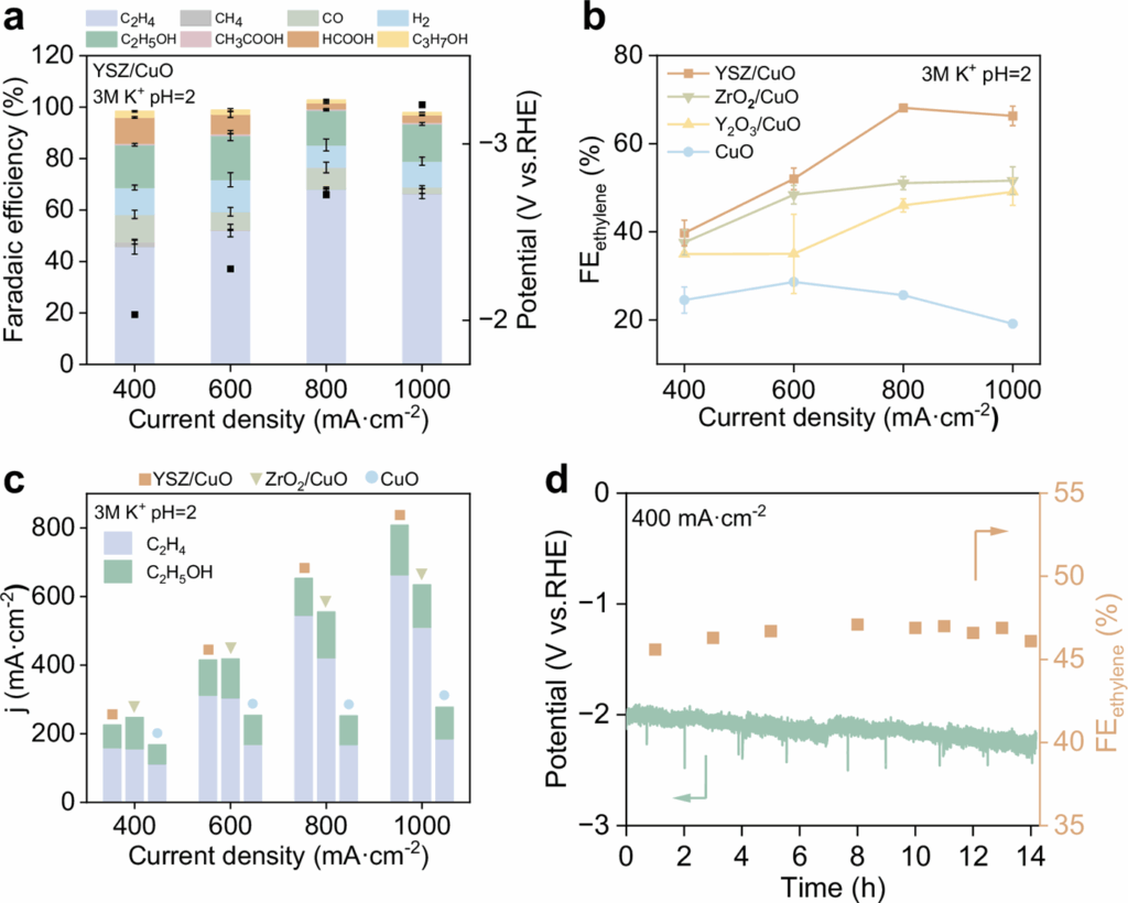 The heart of the discovery lies in a clever materials design. The team dispersed copper on yttrium-doped zirconia (YSZ) support, creating a unique Cu–support interface that keeps copper in a cationic nature, highly active for CO₂ conversion; however, calculations indicate that cationic Cu tends to reduce into metallic copper under harsh acidic conditions. The introduction of yttrium generates oxygen vacancies in zirconia, which help “anchor” these cationic copper sites and prevent over-reduction to metal. This stability allows the catalyst to continue performing the challenging C–C coupling chemistry required to turn CO₂ into ethylene with exceptional efficiency, even in strongly acidic media where most catalysts fail.
